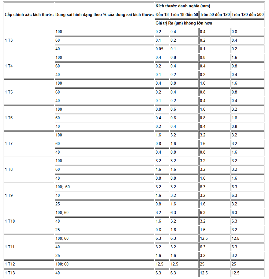 Độ nhám bề mặt còn liên quan đến dung sai kích thước và dung sai hình dạng của chi tiết, có thể xem trong bảng sau:
